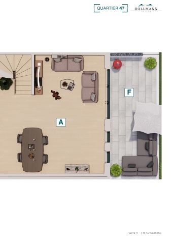 ERDGESCHOSS Grundriss A. WOHNEN/ ESSEN 38,75 m² B. KÜCHE 10,73 m² C. WC C E 2,98 m² D. DIELE/ GARDEROBE F 6,99 m² E. ABSTELLRAUM D 4,85 m² A GESAMT EG 64,30 m² F. TERRASSE B 18,00 m² Seite 10 - ERDGESCHOSS Seite 11 - ERDGESCHOSS