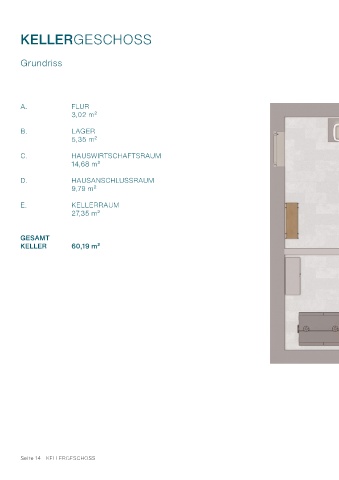 KELLERGESCHOSS Grundriss A. FLUR 3,02 m² B. LAGER 5,35 m² C. HAUSWIRTSCHAFTSRAUM 14,68 m² D. HAUSANSCHLUSSRAUM 9,79 m² C E. KELLERRAUM 27,35 m² A GESAMT E KELLER 60,19 m² D B Seite 14 - KELLERGESCHOSS Seite 15 - KELLERGESCHOSS