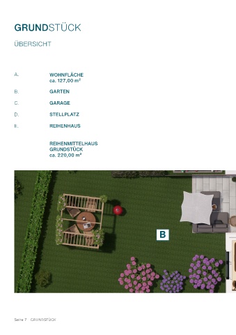 GRUNDSTÜCK E ÜBERSICHT A. WOHNFLÄCHE ca. 127,00 m² B. GARTEN C. GARAGE D. STELLPLATZ D C E. REIHENHAUS REIHENMITTELHAUS GRUNDSTÜCK ca. 220,00 m² B A Seite 7 - GRUNDSTÜCK Seite 8 - GRUNDSTÜCK