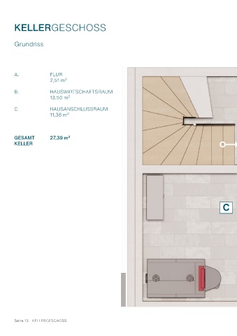 KELLERGESCHOSS Grundriss A. FLUR 2,51 m² B. HAUSWIRTSCHAFTSRAUM 13,50 m² C. HAUSANSCHLUSSRAUM 11,38 m² A GESAMT 27,39 m² KELLER B C Seite 13 - KELLERGESCHOSS Seite 14 - KELLERGESCHOSS