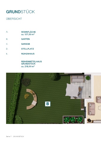 GRUNDSTÜCK E ÜBERSICHT A. WOHNFLÄCHE ca. 127,00 m² B. GARTEN D C C. GARAGE D. STELLPLATZ E. REIHENHAUS REIHENMITTELHAUS GRUNDSTÜCK ca. 218,00 m² B A Seite 7 - GRUNDSTÜCK Seite 8 - GRUNDSTÜCK