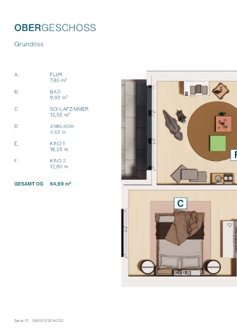 OBERGESCHOSS Grundriss A. FLUR 7,65 m² B. BAD 9,92 m² C. SCHLAFZIMMER 13,55 m² D. ANKLEIDE 4,52 m E E. KIND 1 16,25 m F F. KIND 2 12,80 m A GESAMT OG 64,69 m² C D B Seite 12 - OBERGESCHOSS Seite 13 - OBERGESCHOSS
