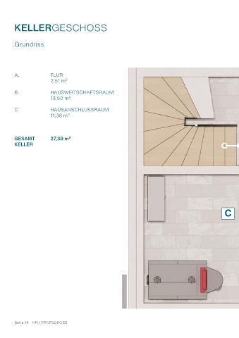 KELLERGESCHOSS Grundriss A. FLUR 2,51 m² B. HAUSWIRTSCHAFTSRAUM 13,50 m² C. HAUSANSCHLUSSRAUM 11,38 m² A GESAMT 27,39 m² KELLER B C Seite 14 - KELLERGESCHOSS Seite 15 - KELLERGESCHOSS