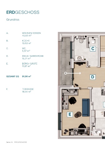 ERDGESCHOSS Grundriss A. WOHNEN/ ESSEN 45,62 m² B. KÜCHE 13,63 m² C. WC C 5,57 m² D. DIELE/ GARDEROBE 15,21 m² E. BÜRO/ GÄSTE F 11,87 m² GESAMT EG 91,90 m² D A F. TERRASSE 18,00 m² B E Seite 10 - ERDGESCHOSS Seite 11 - ERDGESCHOSS