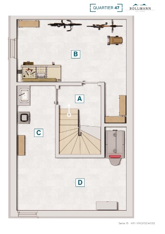 KELLERGESCHOSS Grundriss A. FLUR B 2,51 m² B. KELLERRAUM 19,50 m² C. HAUSWIRTSCHAFTSRAUM 7,13 m² D. HAUSANSCHLUSSRAUM/ LAGER 16,10 m² A GESAMT 45,24 m² KELLER C D Seite 14 - KELLERGESCHOSS Seite 15 - KELLERGESCHOSS