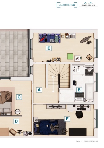 OBERGESCHOSS Grundriss A. FLUR 10,86 m² B. BAD 8,82 m² C. SCHLAFZIMMER E 14,44 m² D. ANKLEIDE 8,10 m E. KIND 1 15,64 m F. KIND 2 17,01 m GESAMT OG 74,87 m² A B C F D Seite 11 - OBERGESCHOSS Seite 12 - OBERGESCHOSS